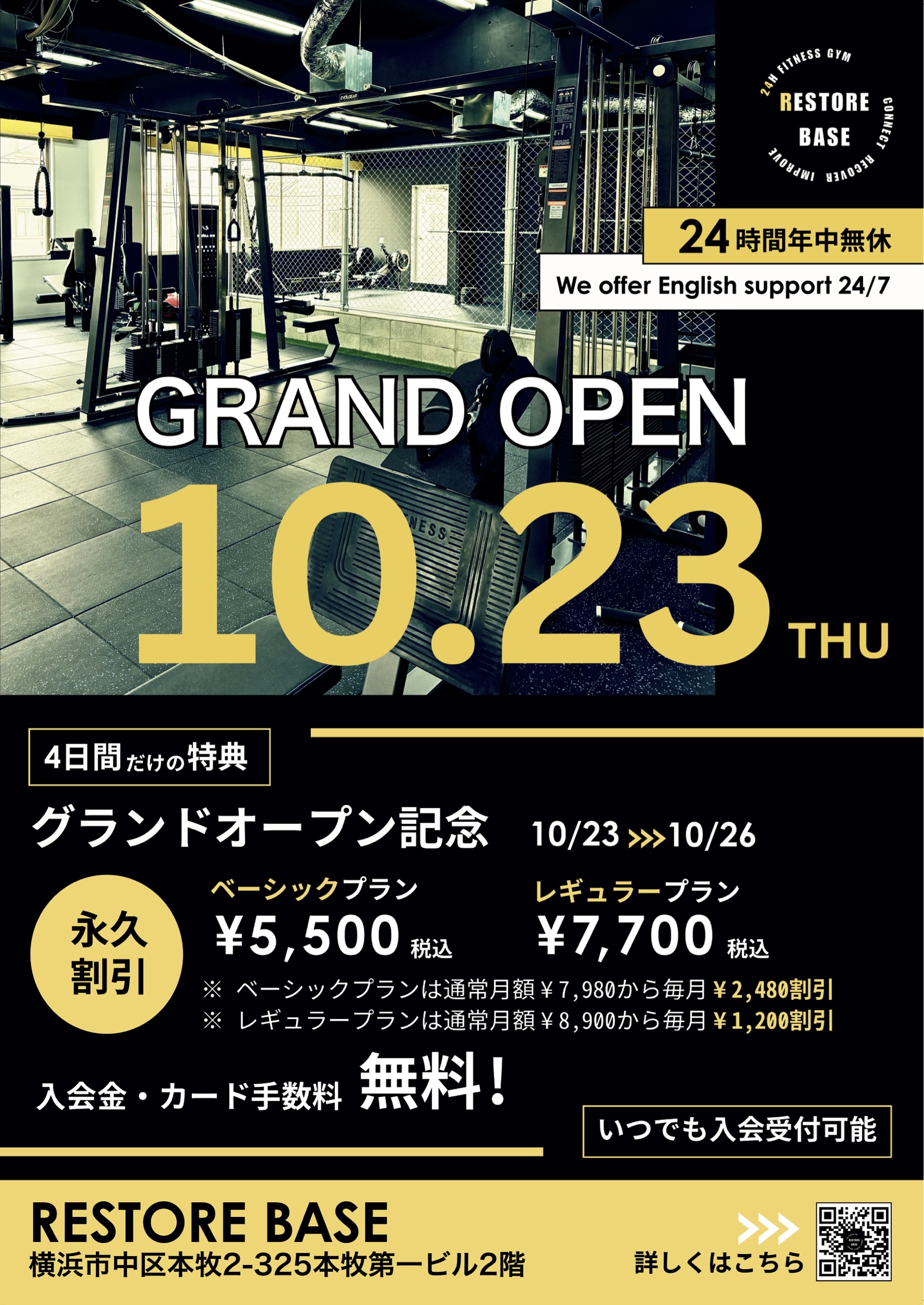 2025.10.23 4日間だけの特別なグランドオープンキャンペーン開催! 🎉 グランドオープン記念! 🎉 2025年10月23日に新しくジムがグランドオープンしました! オープンを記念して、4日間限定の特別価格として、月会費 5,500円の永久割をご利用いただけます。 さらに、入会金・カード発行手数料無料でとってもお得! このチャンスをお見逃しなく✨ 投稿ナビゲーション